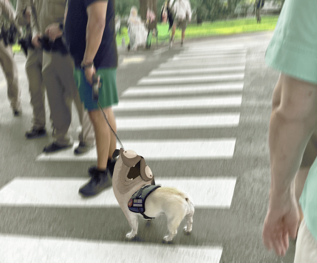 Deputy Ortiz and K-9 unit Pickles (traumatized pug, fears corn) arrive.