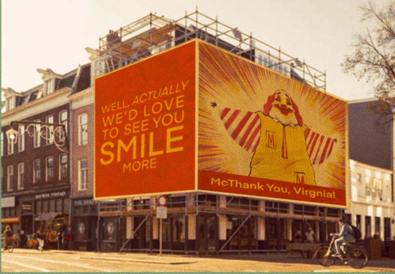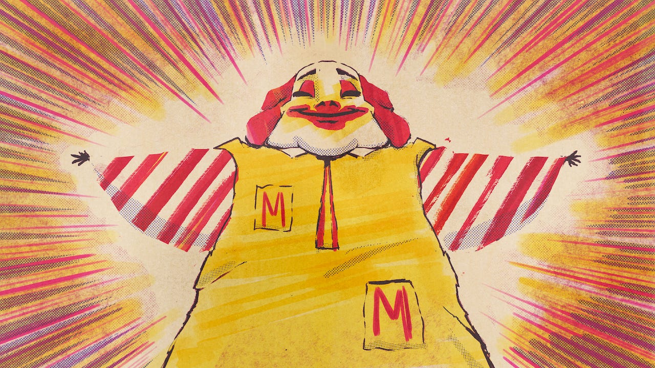 The closing time‑lapse shows 2025 Ronald shedding the happy‑clown grin and growing into a boardroom tyrant. Pinstripe clown suit, golden grease‑smudged smile tuned to quarterly earnings. Watch each McStroke layer a little more dread, one frame at a time.